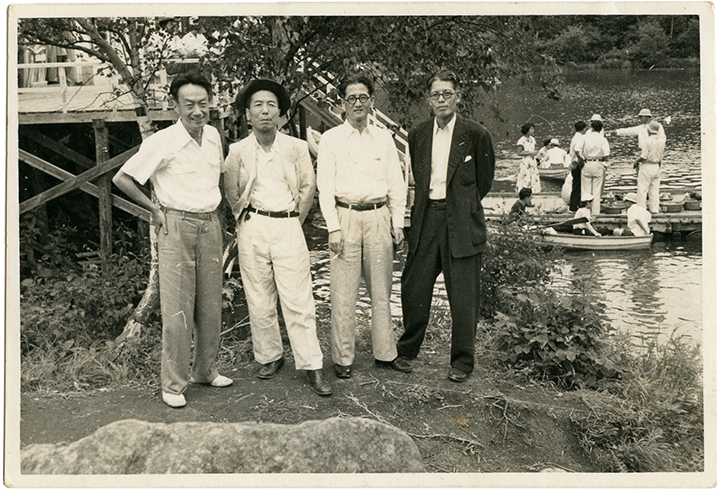 向かって右から桑原武夫、生島遼一、三好達治、大岡昇平。昭和29年(1954)志賀高原丸池付近にて。