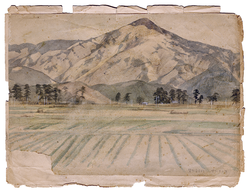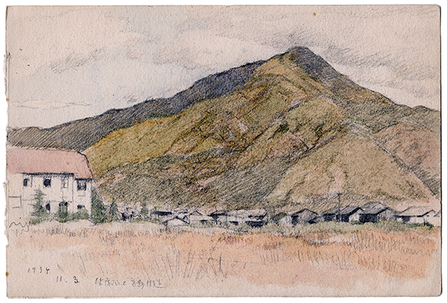 方角は少し異なるが下の絵が描かれた年から11年後の1934(昭和9年)、京都高野付近で描かれた比叡山のスケッチ。