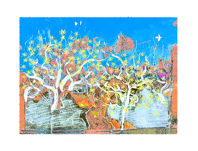 <拡大>今まさに沸きたたんとする春を、パステル画風にラフなタッチで表現。