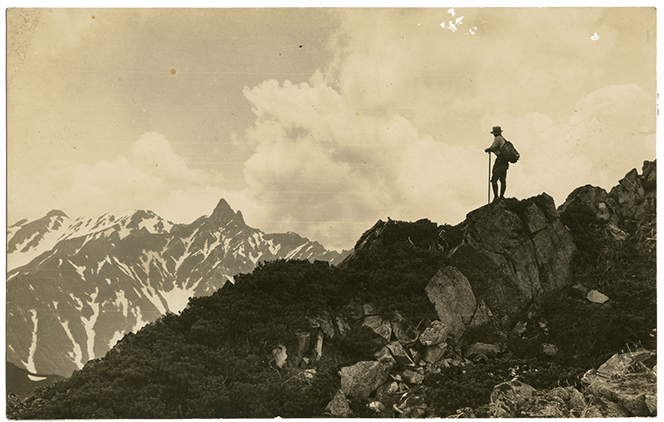 向かって右から桑原武夫、生島遼一、三好達治、大岡昇平。昭和29年(1954)志賀高原丸池付近にて。