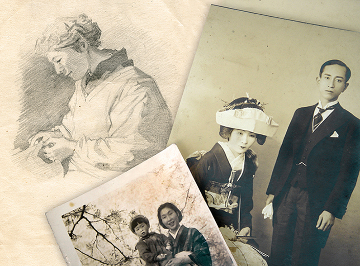 奥村の妻、雅世さんの「素描」と結婚式の写真、長女を抱っこした雅世さんの写真のコラージュ。