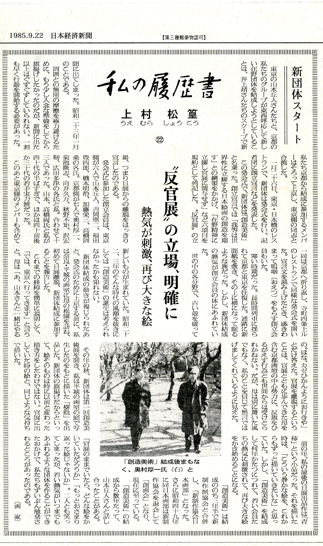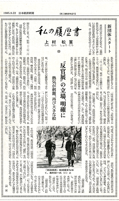 1985年(昭和60年)上村松篁氏の新聞記事。結成当時の心境などが語られている。