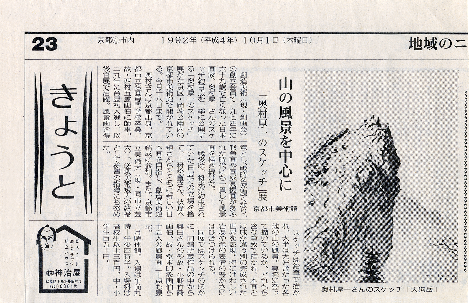 1992年(平成4年)京都市美術館「奥村厚一のスケッチ展」新聞記事