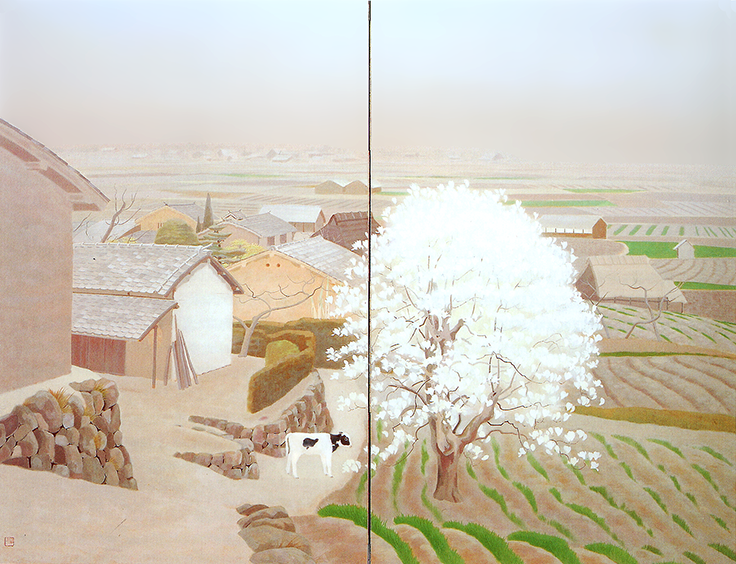 「春昼」絹本膠彩 二曲一双屏風